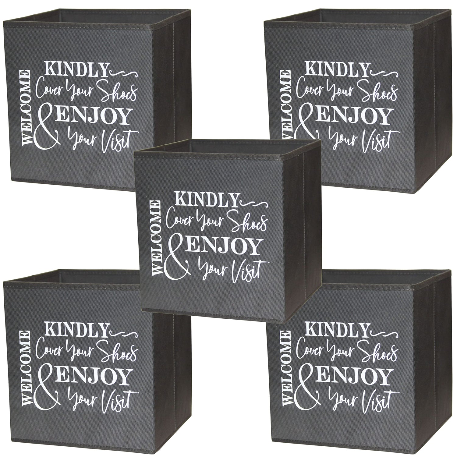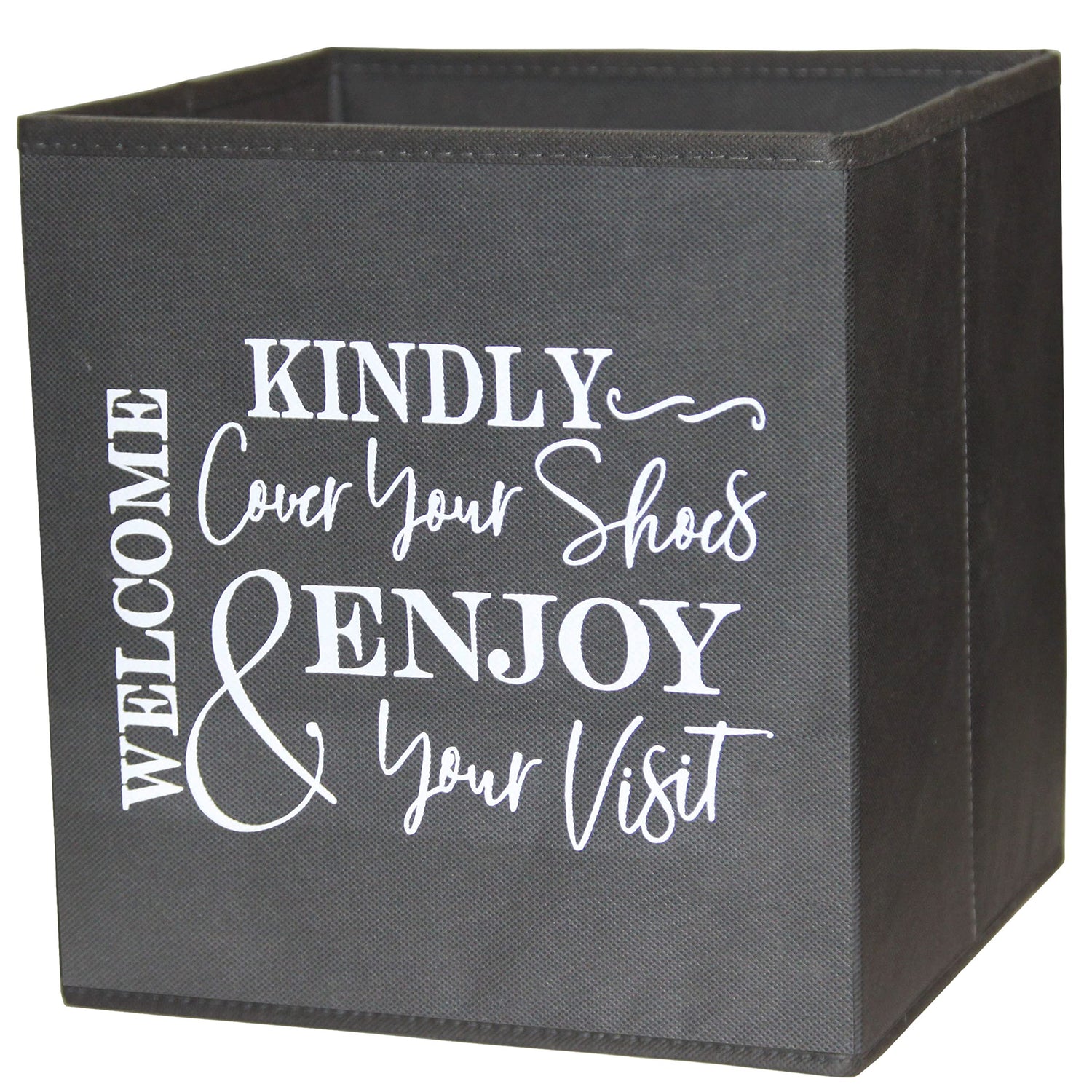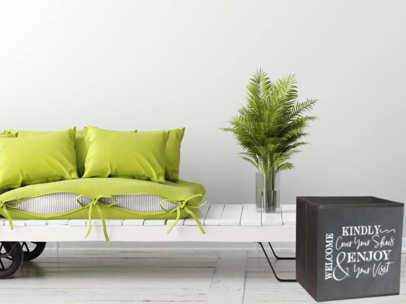 - ✅ Shoe Cover Box for Indoor Use - Sturdy, Stylish Foldable Bootie Boxes. The Perfect size, unfold to 11 x 10.5 x 10.5 inches, and folds flat to 0.75 (3/4) of an inch. Quality construction of non-woven fabric, with an interior lining and an insert to be placed at the bottom of the box for added stability. Bin can easily dispense 200+ disposable shoe covers. A unique design, for men and women, instructing guests to kindly cover shoes.
