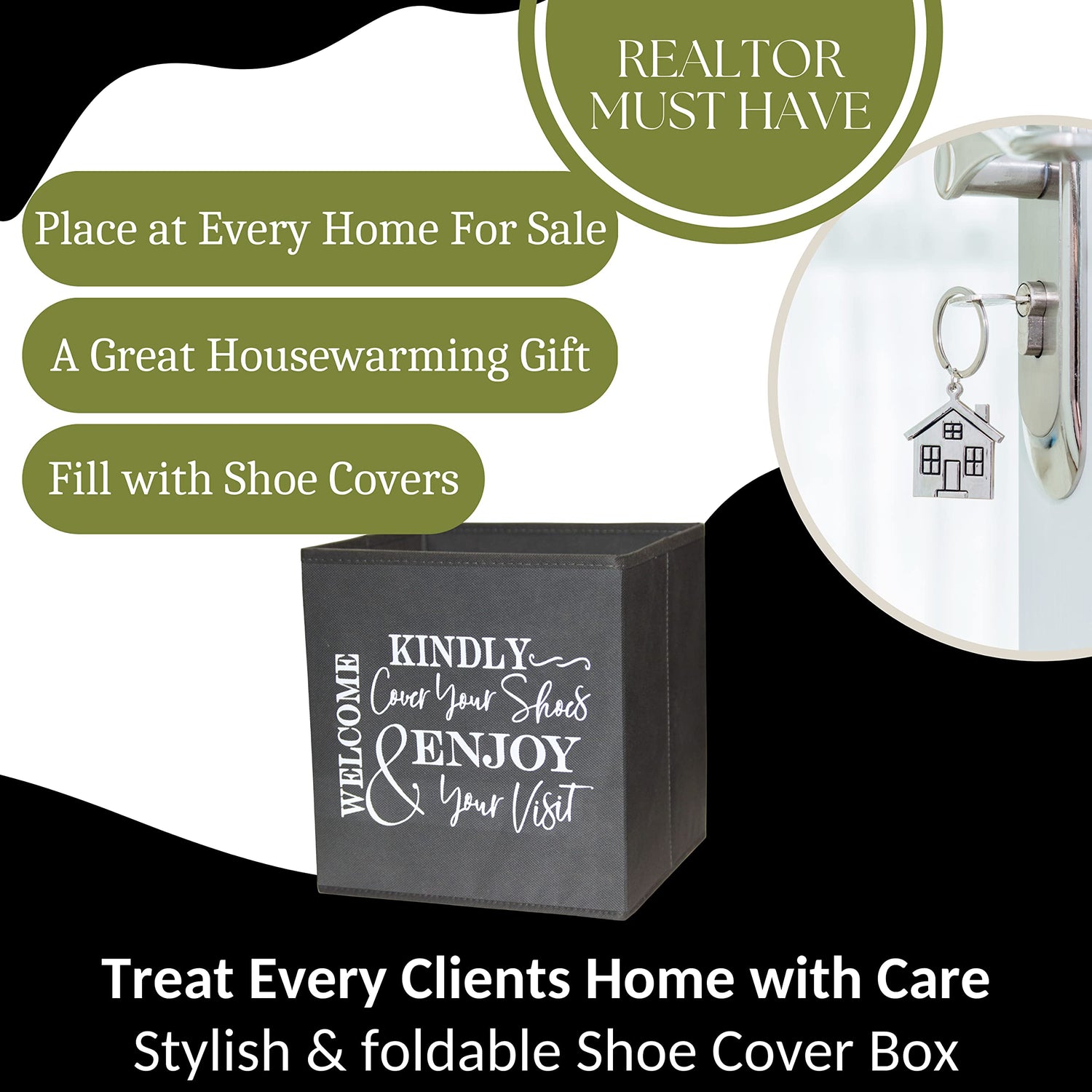 - ✅ Real Estate Agent Supplies - Professional Real Estate Agents should put these foldable shoe cover boxes inside every home listing. Loan one to every home you have listed for sale, or send one as a client gift to every new listing. Show the care you take to help protect their carpet and floor from tracking outside rain, snow or dirt inside during showings. These shoe cover holder boxes add an extra touch of class to your Real Estate Listing Service!