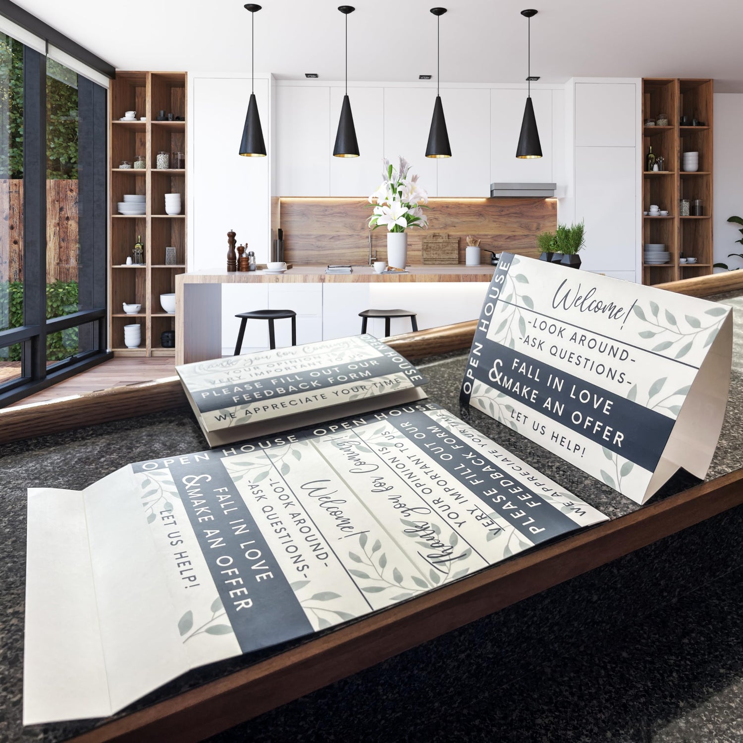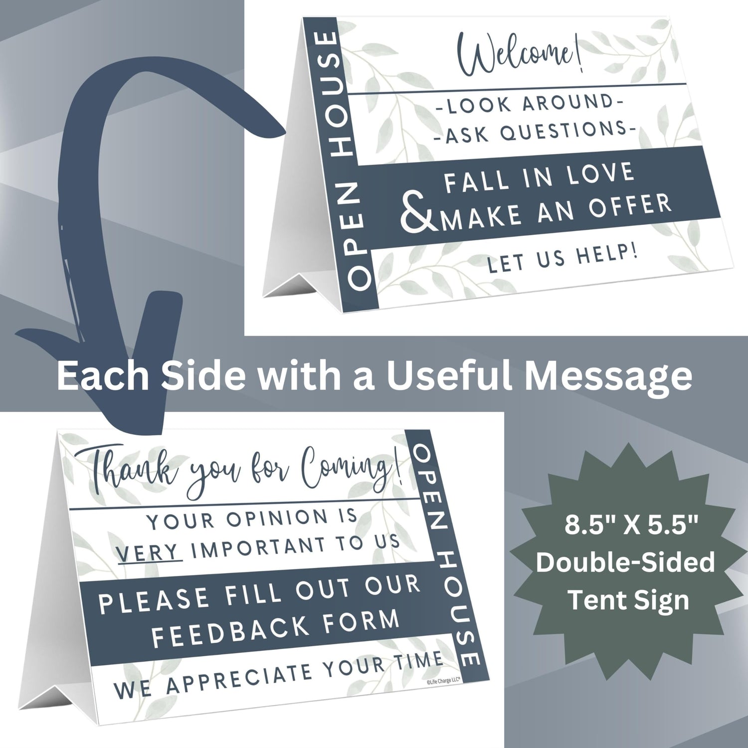 - OPEN HOUSE ESSENTIALS: Perfect for Real Estate Agents & Home Sellers. An indispensable toolkit for any Open House. Our aesthetically pleasing sign-in notepads for visitors pair wonderfully with our dual-sided Open House door hangers & tabletop display signs. Each instructive door hanger & tabletop sign features two unique messages, one on each side. Our kit includes Two of Each: 50-page 8.5” X 5.5” notepads, Tent Cards 8.5” X 5.5” & Door Hanger Signs 3.5” X 8.5.” Six Items.