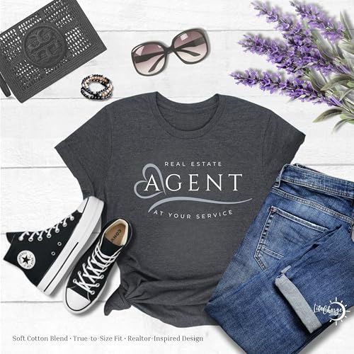 Real Estate Agent T-Shirt for Women – “at Your Service” Realtor Gift Top – Soft Charcoal Heather Cotton Blend – Relaxed Fit Crew Neck – Made in USA – Lead-Generating Real Estate Shirt - Medium