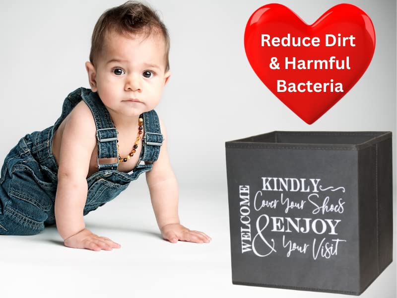 - ✅ Shoe Cover Box for Indoor Use - Sturdy, Stylish Foldable Bootie Boxes. The Perfect size, unfold to 11 x 10.5 x 10.5 inches, and folds flat to 0.75 (3/4) of an inch. Quality construction of non-woven fabric, with an interior lining and an insert to be placed at the bottom of the box for added stability. Bin can easily dispense 200+ disposable shoe covers. A unique design, for men and women, instructing guests to kindly cover shoes.